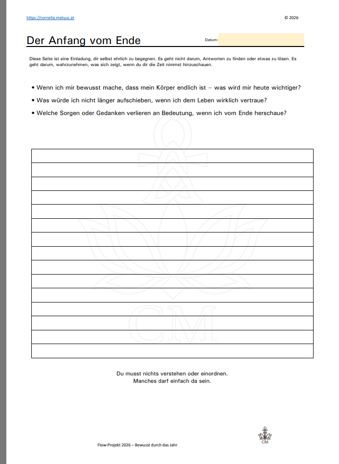 Wenn wir akzeptieren, dass Formen vergehen, fällt es leichter, dem Moment Bedeutung zu geben. Beziehungen werden ehrlicher. Entscheidungen klarer. Prioritäten verschieben sich. Nicht aus Angst – sondern aus Bewusstsein.