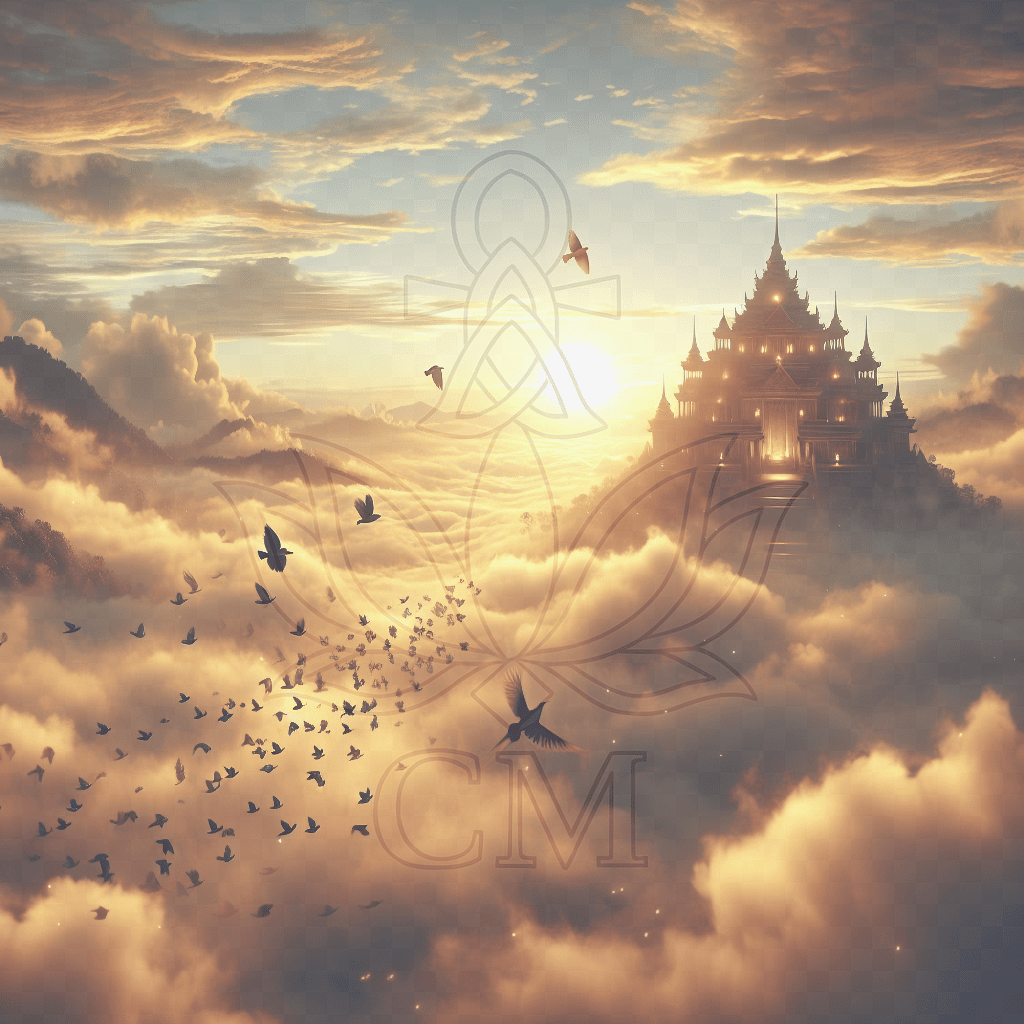 Als der erste Strahl der Sonne die Nebeldecke durchbrach, erwachte der Himmel in sanftem Gold. Der Tempel, hoch über den Wolken, glühte wie aus Licht geformt – und dort begann